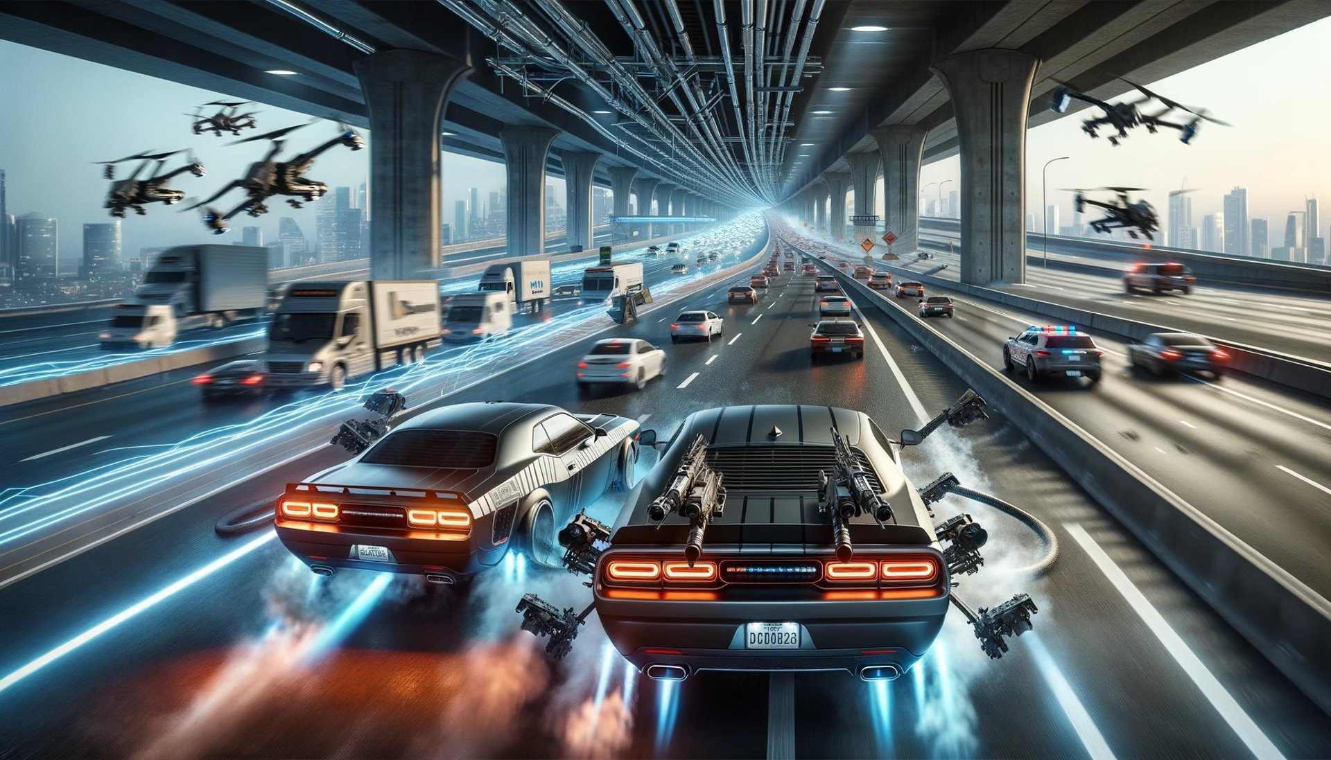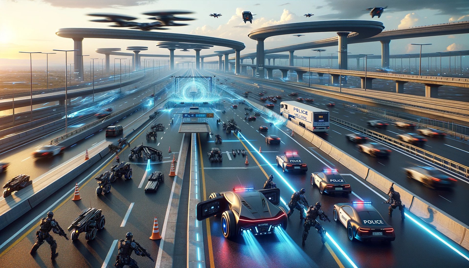 As they rounded a bend, the road ahead became still, civilian vehicles disabled sitting dead in place, ending in a line of flashing lights stretched across the wide road. Automated concrete barriers rise out of slots in the road, and behind them teams of human and drone swat units level their weapons at the approaching cars.