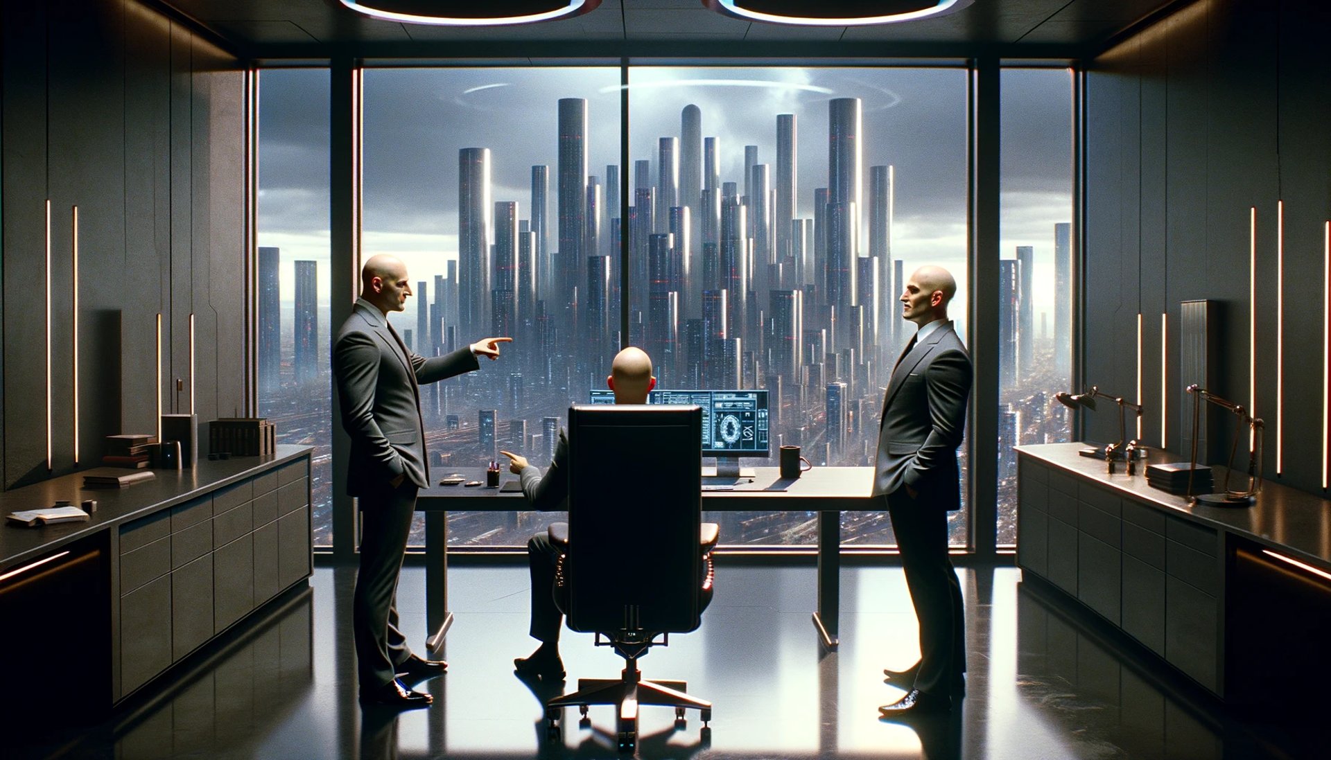 In the sanctum of their sleek office, they stand as Gods over the dystopian expanse, their small, subtle cybernetic implants barely noticeable, yet integral to their grand scheme. One, gesturing towards the sprawling metropolis, speaks of music as a tool, a leviathan to sway the masses. Across the desk, his ally nods in agreement, "Music binds the masses and drives the individual, it is a means to influence people. We now have the technology and mandate to dissect each part of the humans interaction with music and rebuild it so as to ensure a safer more sustainable society. I cant agree more Sir." said the figure standing across the desk.