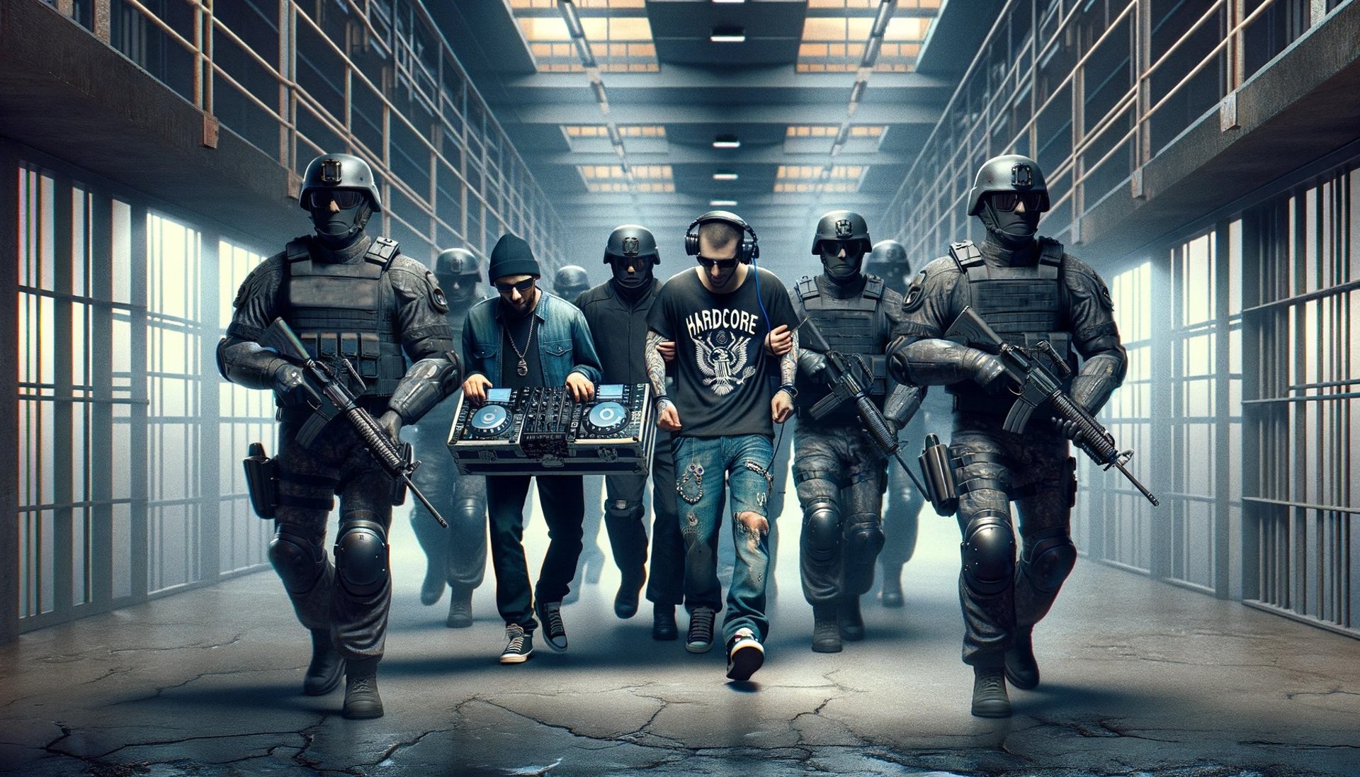 "We acquired some mute DJs from recycling to have a closer look at what's going on in their heads," he explained, as the screen shifted to a chilling scene. Rows of DJs, their talents now silenced, were herded into a bleak, fortified prison facility.