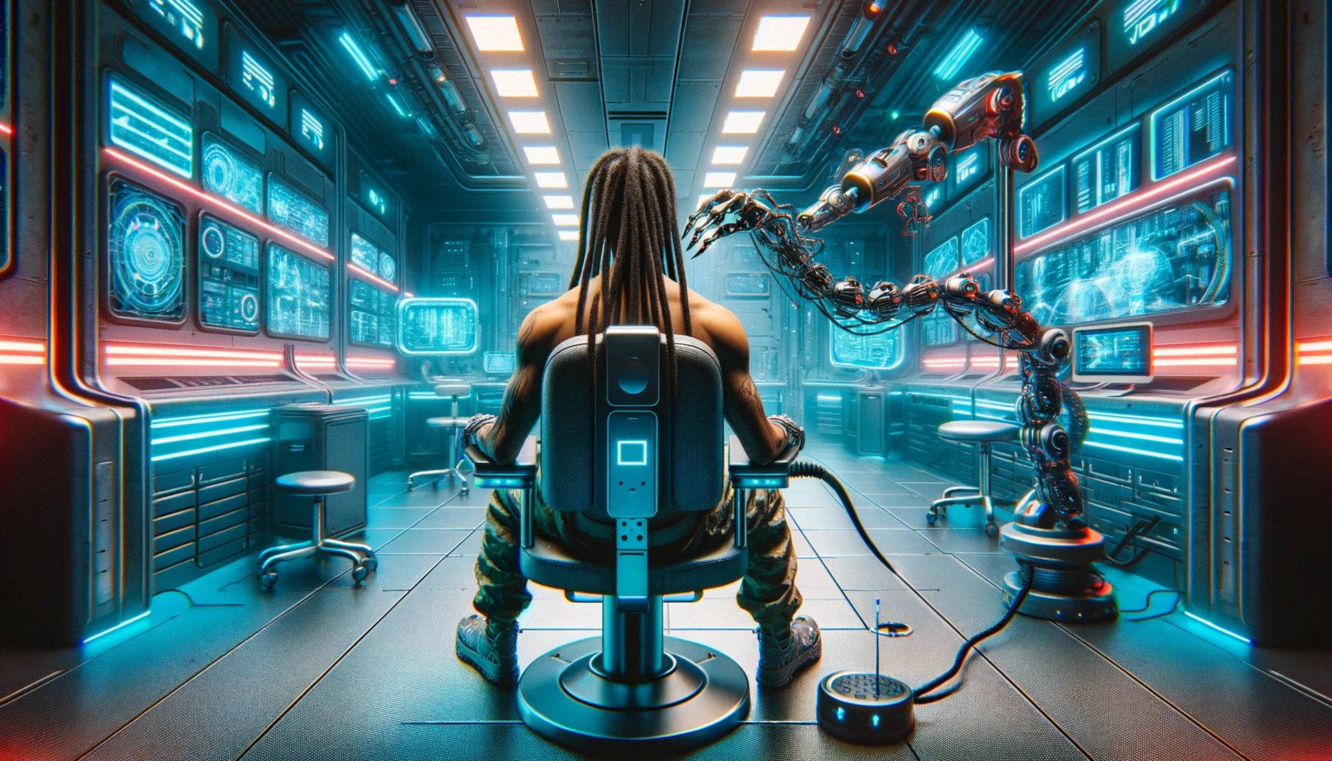 Here, a DJ finds himself restrained in the grasp of the future. Strapped to a medical chair, he is both a subject and an Instrument in a cybernetic symphony. The small robotic caterpillar-like implant, a harbinger of change, is delicately aligned with his head.